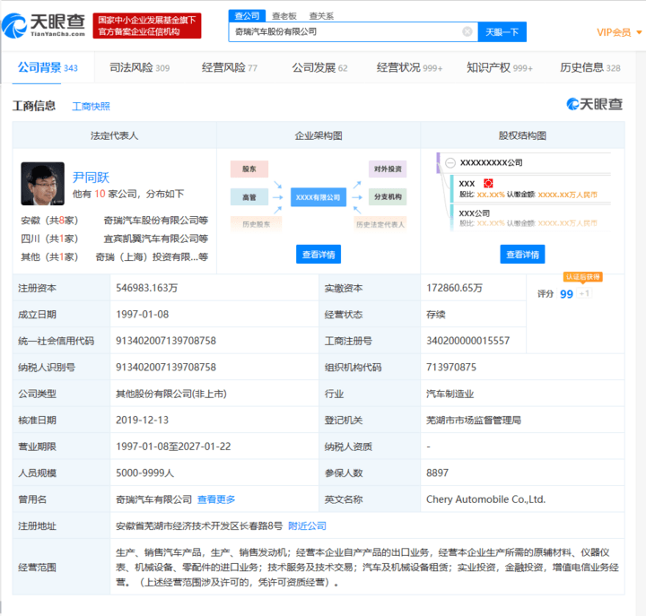 天眼查數據顯示,12月16日,奇瑞汽車的運營主體奇瑞汽車股份有限公司發生一系列變更。其中,29位高管集體退出,同時新增高管10位。此外,注冊資本由原來的約44.6億,新增至約54.7億,增幅為22.73%。