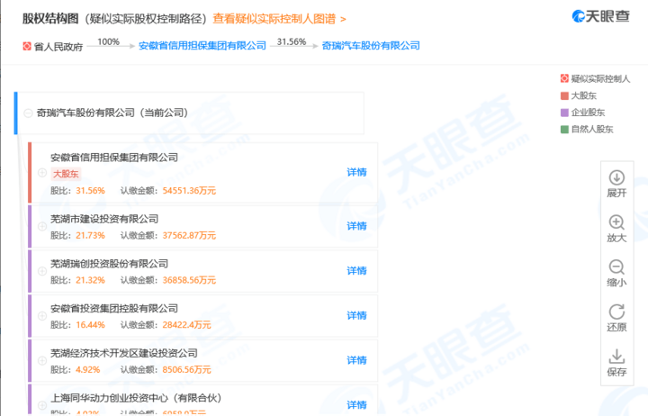 奇瑞汽車股份有限公司成立于1997年1月,法定代表人為董事長尹同躍,經營范圍包括生產、銷售汽車產品,生產、銷售發動機;汽車及機械設備租賃;實業投資,金融投資等。根據其股權結構,安徽省信用擔保集團有限公司為其大股東,持股31.56%,蕪湖市建設投資有限公司為第二大股東,持股21.73%。